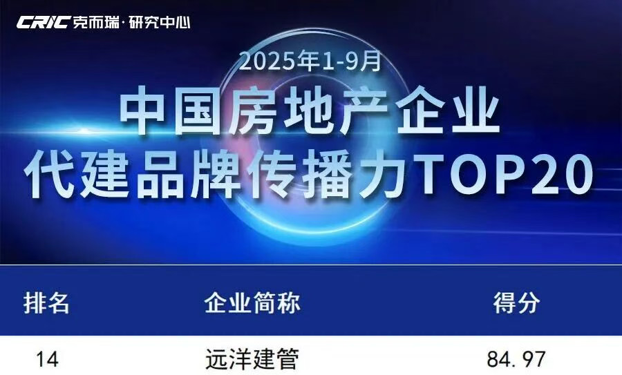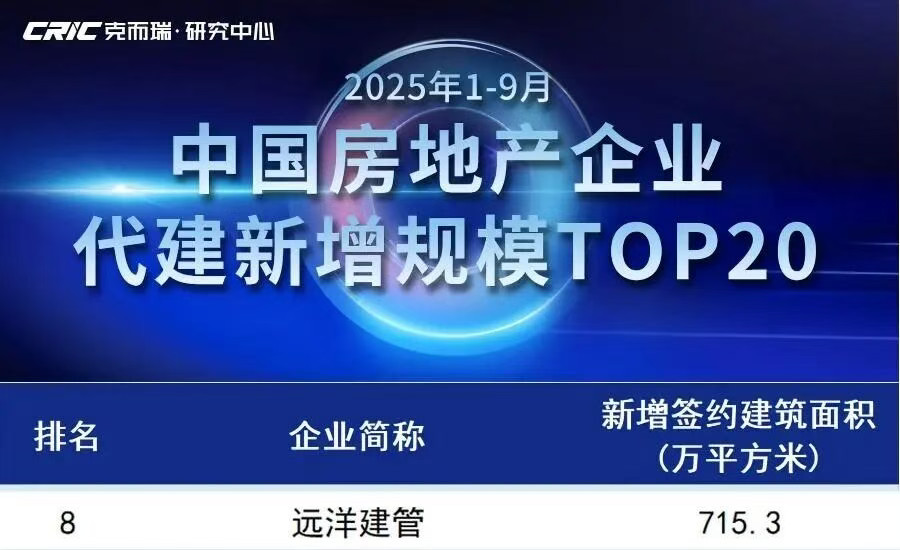 10月13日,克而瑞发布“2025年1-9月中国房地产企业代建TOP20”榜单,远洋集团旗下代建业务品牌——远洋建管位列「代建新增规模榜」第8位。