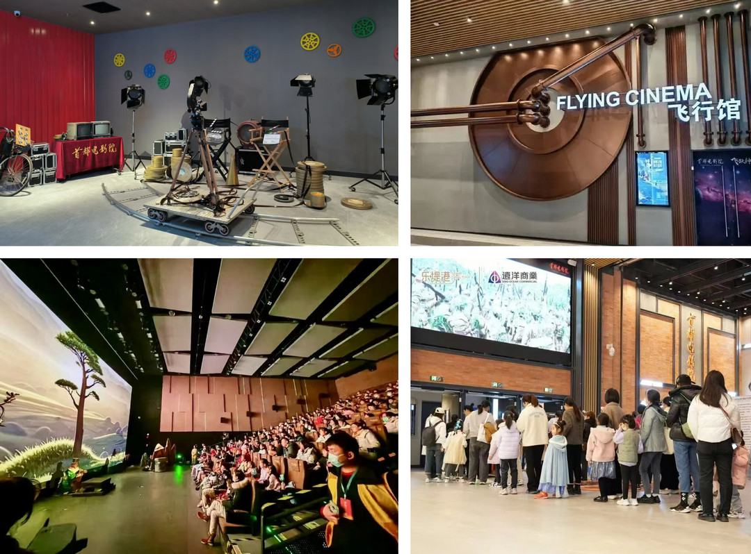 拥有88年历史的“首都电影院”则在北京远洋乐堤港创新定义了影院新空间,打造出集电影放映、休闲体验、娱乐社交于一体的文化休闲场所。除了常规的标准影厅外,还开设了"飞行馆"和"光影馆"两大特色主题场馆。飞行馆引入与环球影城同款的大型游乐设备,结合360度球幕,为观众带来《飞跃神州》等沉浸式游乐体验;光影馆则是以沉浸体验为表现形式,先后引进《敦煌IMAX》《穿越时空的大运河》等新媒体艺术展。2025年,首都电影院发布“新新剧场”品牌,正式将“首影·演艺”落地于本项目,打造独属于影院空间的演艺秀场,让影院成为多元化文化娱乐综合空间的展示平台。